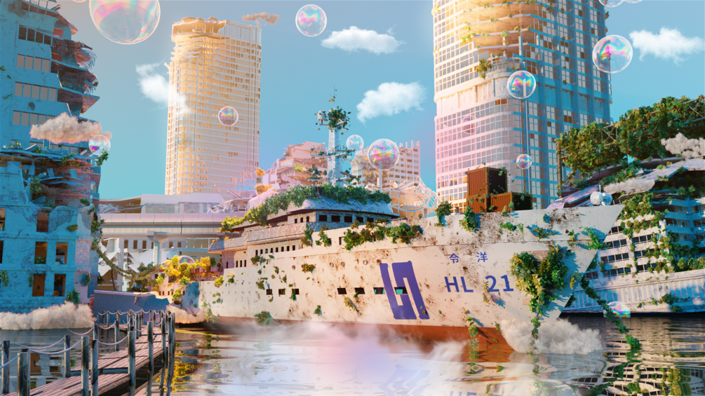Create a stunning post-apocalyptic cityscape where nature reclaims urban ruins, featuring a sunken ship, overgrown skyscrapers, and atmospheric lighting.