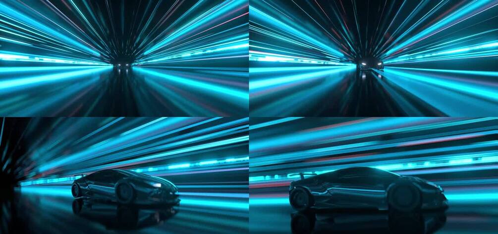 With Animation! A sleek sports car emerges through a tunnel of dynamic neon-blue light streaks, creating a cinematic cyberpunk atmosphere that radiates speed and futuristic energy.